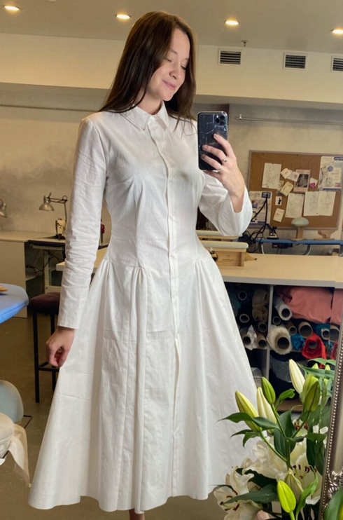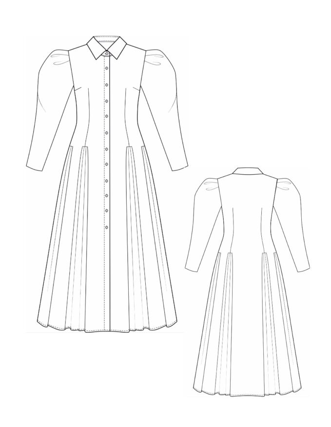 Платье-рубашка женское, полуприлегающего силуэта, длиной до середины голени. Перед и спинка с вертикальными вытачками. Нагрудная вытачка из бокового шва. На переде и спинке на продолжении вытачек и на боковом шве притачиваются конические клинья со сборкой. Застежка по центру переда на вертикальные петли и пуговицы 8-10мм на цельнокроеной планке. Воротник стояче-отложной с отрезной стойкой.
